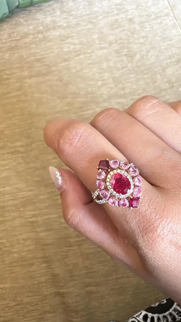 Set in 18K Gold, natural Mozambique Ruby, Pink Sapphire & Diamonds Cocktail Ring
